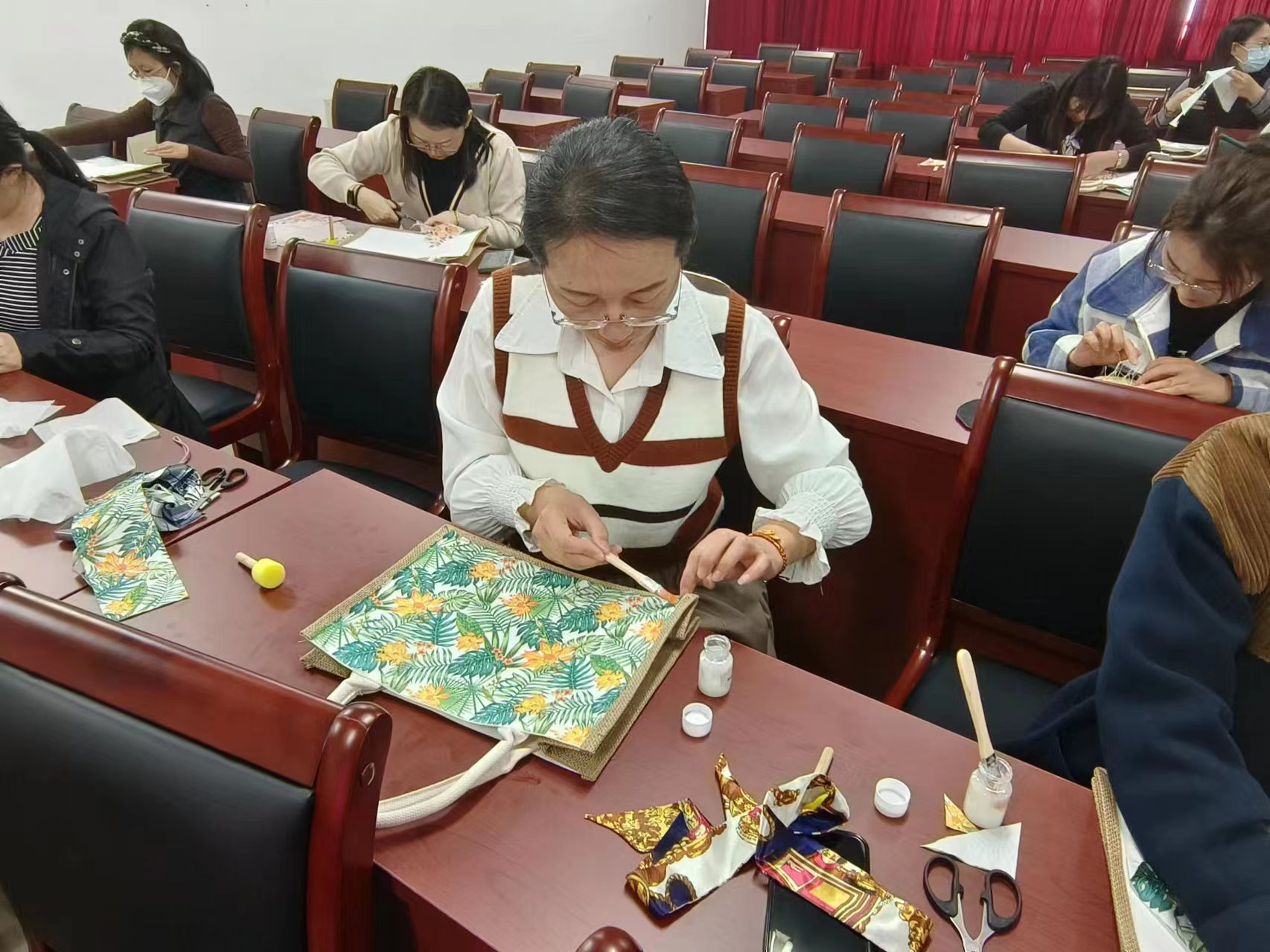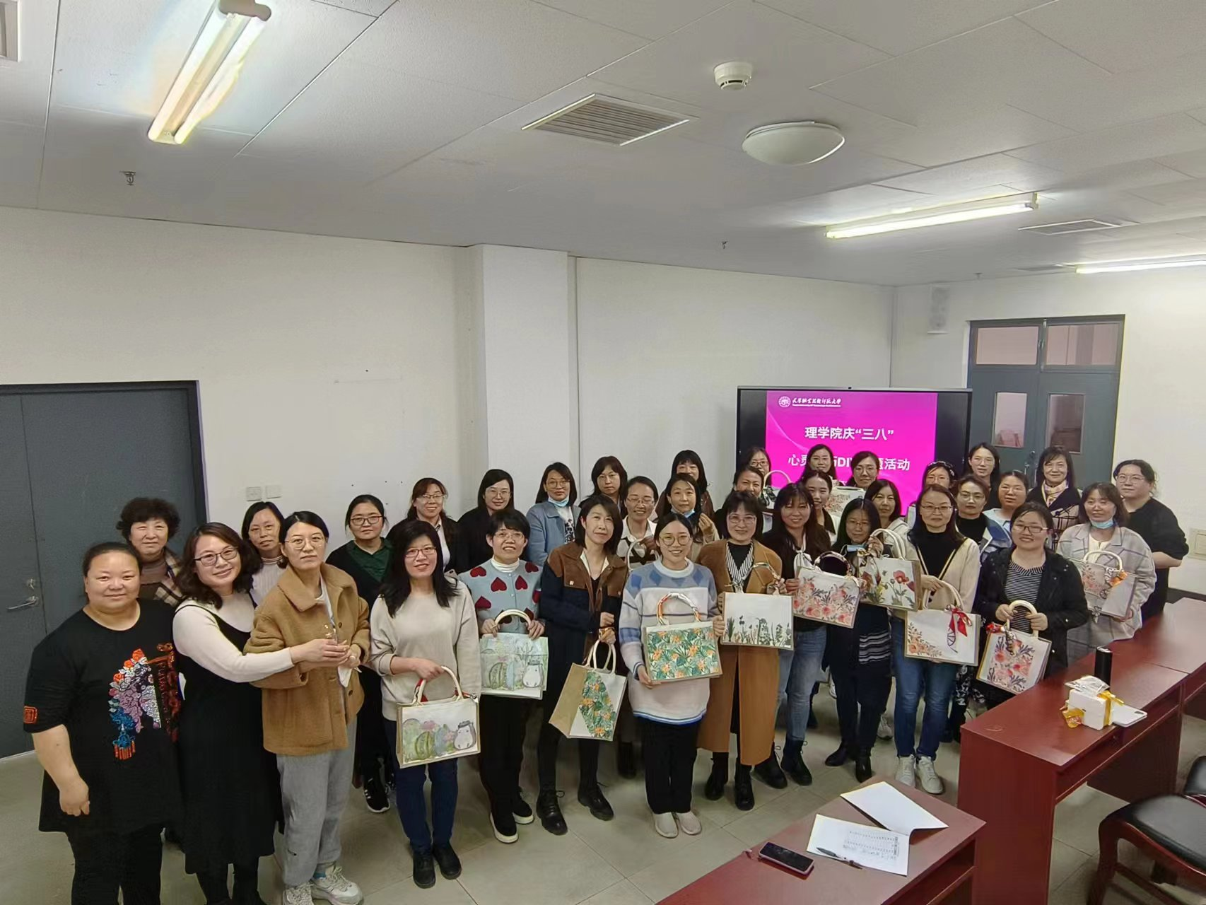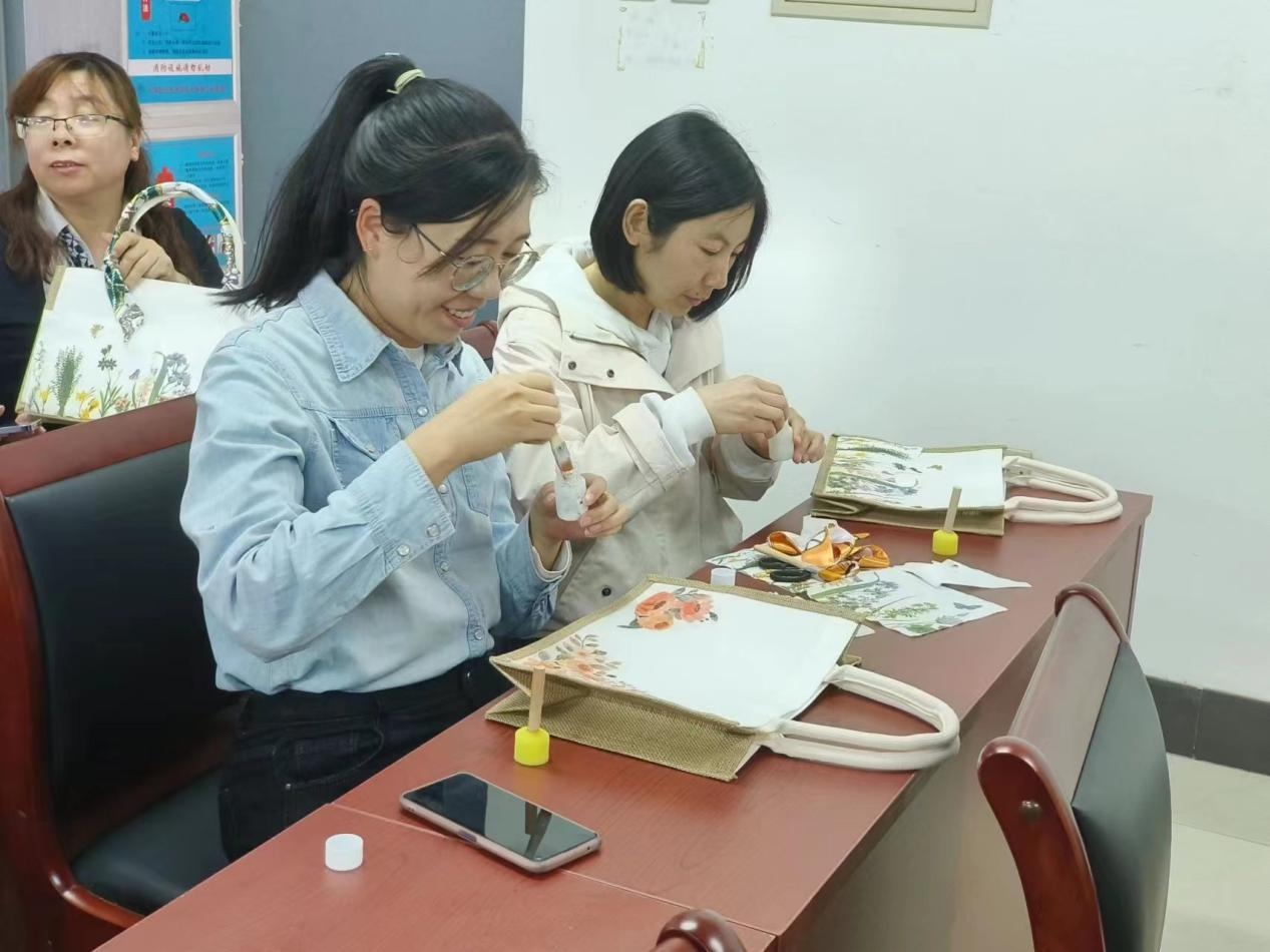 心灵手巧DIY主题活动在这里举行,学院工会进行了精心的组织和安排,共有45名女教工参加。活动现场为每位老师准备了DIY的材料,有帆布包,有串珠,有小夜灯等材料。老师们边学边做,一边裁剪,一边交流探讨,充分展示了她们的动手能力,现场气氛活跃,印证了“动手动脑、全面发展”不仅是工科老师的强项,理科老师不仅理论课教的好,动手能力也不差。
