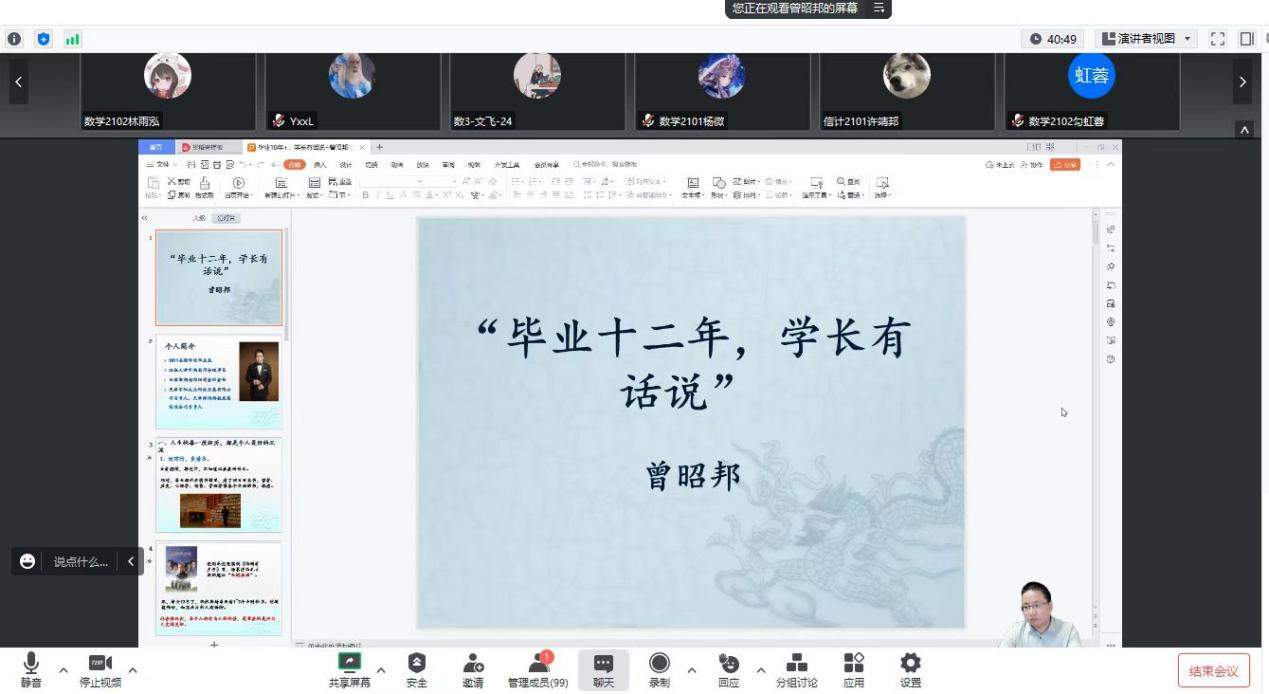 举办了主题为“同心促就业 暖心助启航”之“毕业十二年,学长有话说”的优秀毕业生经验分享会。分享会由应用物理系主任兼物理教工党支部书记盛朝霞老师主持,会议邀请了2011届优秀毕业生曾昭邦做分享。据统计,超过100名的学弟学妹们参加了本次分享会。