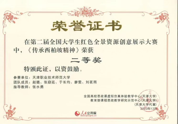 学生赵璐、张窈廷、于长均、廖雯和刘铭雨提交的参赛作品《传承西柏坡精神》,在比赛中荣获二等奖。