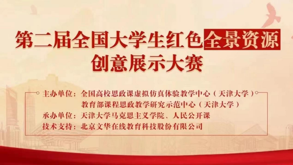 据悉,第二届全国大学生红色全景资源创意展示大赛由全国高校思政课虚拟仿真体验教学中心(天津大学)、教育部课程思政教学研究示范中心(天津大学)主办,天津大学马克思主义学院、人民公开课承办,大赛旨在综合运用全景超高清、虚拟现实等现代信息技术,全景展示博物馆、纪念馆、革命旧址遗址等资源,发挥好红色资源在弘扬以伟大建党精神为源头的中国共产党人精神谱系中的独特作用。