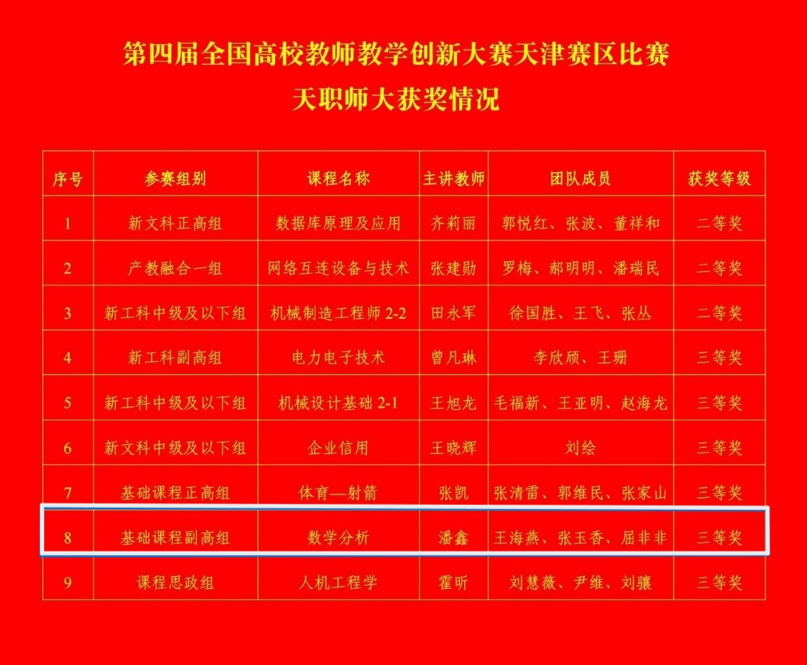 潘鑫老师为代表的数学分析课程组获得天津赛区三等奖。