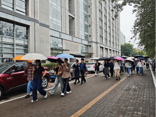 最终,全体教职工顺利抵达终点中国-上海合作组织职业技术教育合作中心。大家在终点处合影留念,脸上洋溢着收获的喜悦。学院老师表示,此次健步走活动意义非凡,在雨中行走不仅锻炼了身体,更在沿途的景观中感受到了学校 46 年来的巨大变化。作为天美传播媒体