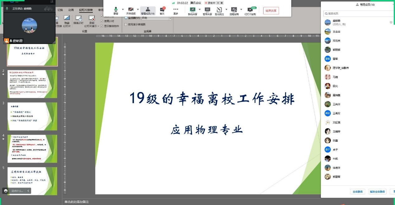 物理教工党支部为2018级的物理专业毕业生组织了线上欢送会,鼓励今年成功就业和考研的学生面向2019级学生分享成功经验,从而进一步推动明年物理专业毕业生就业和考研。结合往年经验,支部将2019级学生的就业和考研帮扶工作取名为“幸福离校计划”,希望2019级毕业生离校时都能充满幸福感。