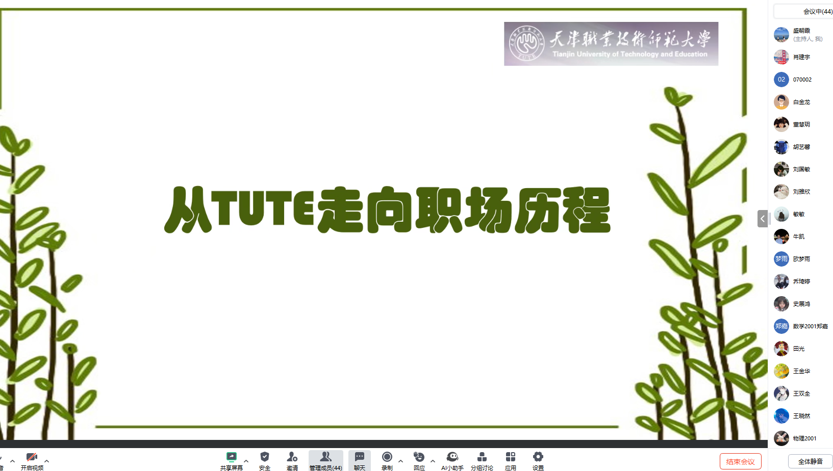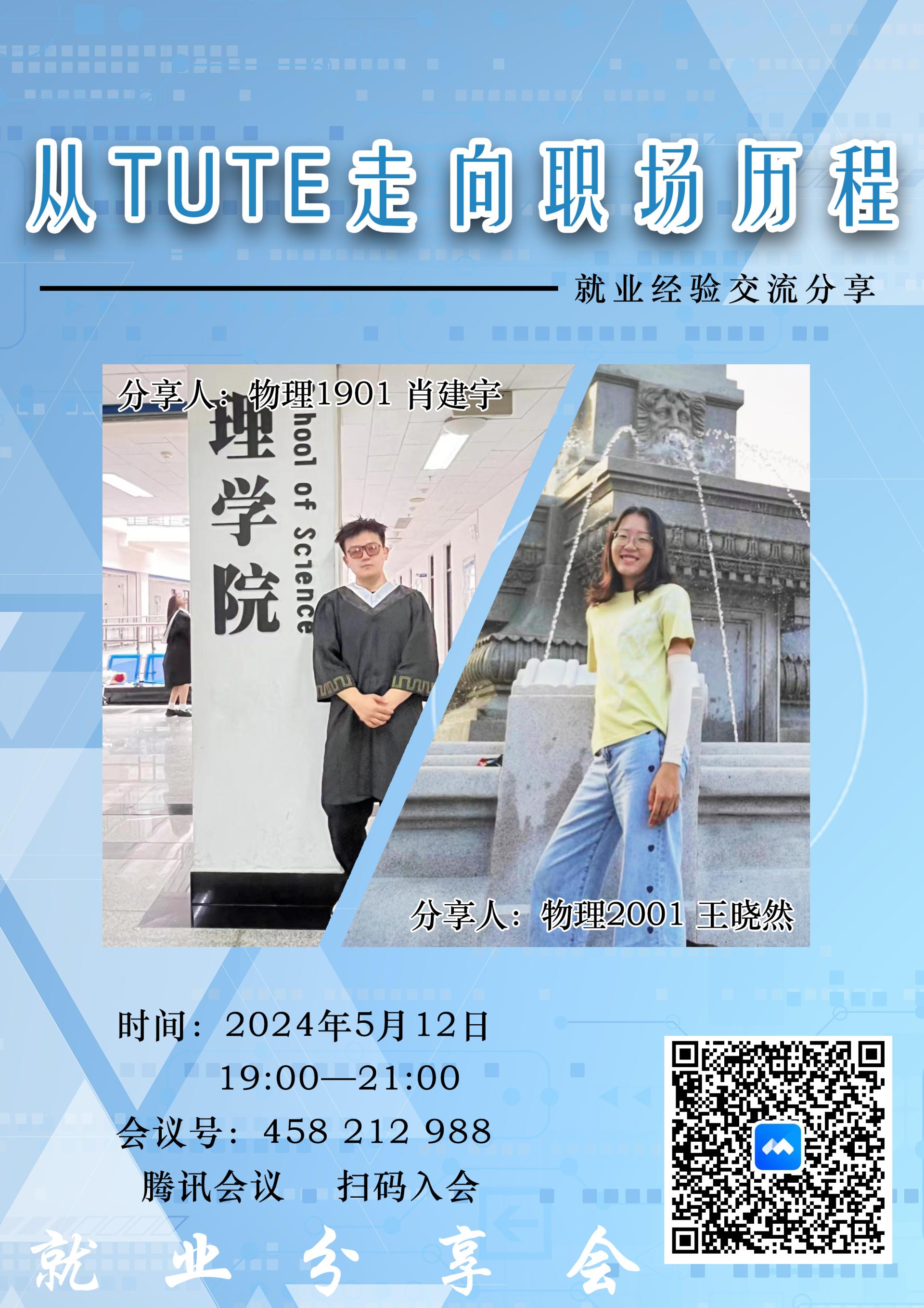 物理教工党支部为发挥好支部的先锋模范作用,特此召开了“从TUTE走向职场历程”的线上就业经验交流分享会。会议由支部书记盛朝霞老师主持,参与的同学覆盖了从大一到大四的各个年级各个专业的学生。本次分享会邀请了物理1901的肖建宇学长(大族激光的激光工程师),和物理2001的王晓然学姐(凯普林光电的激光工程师)。
