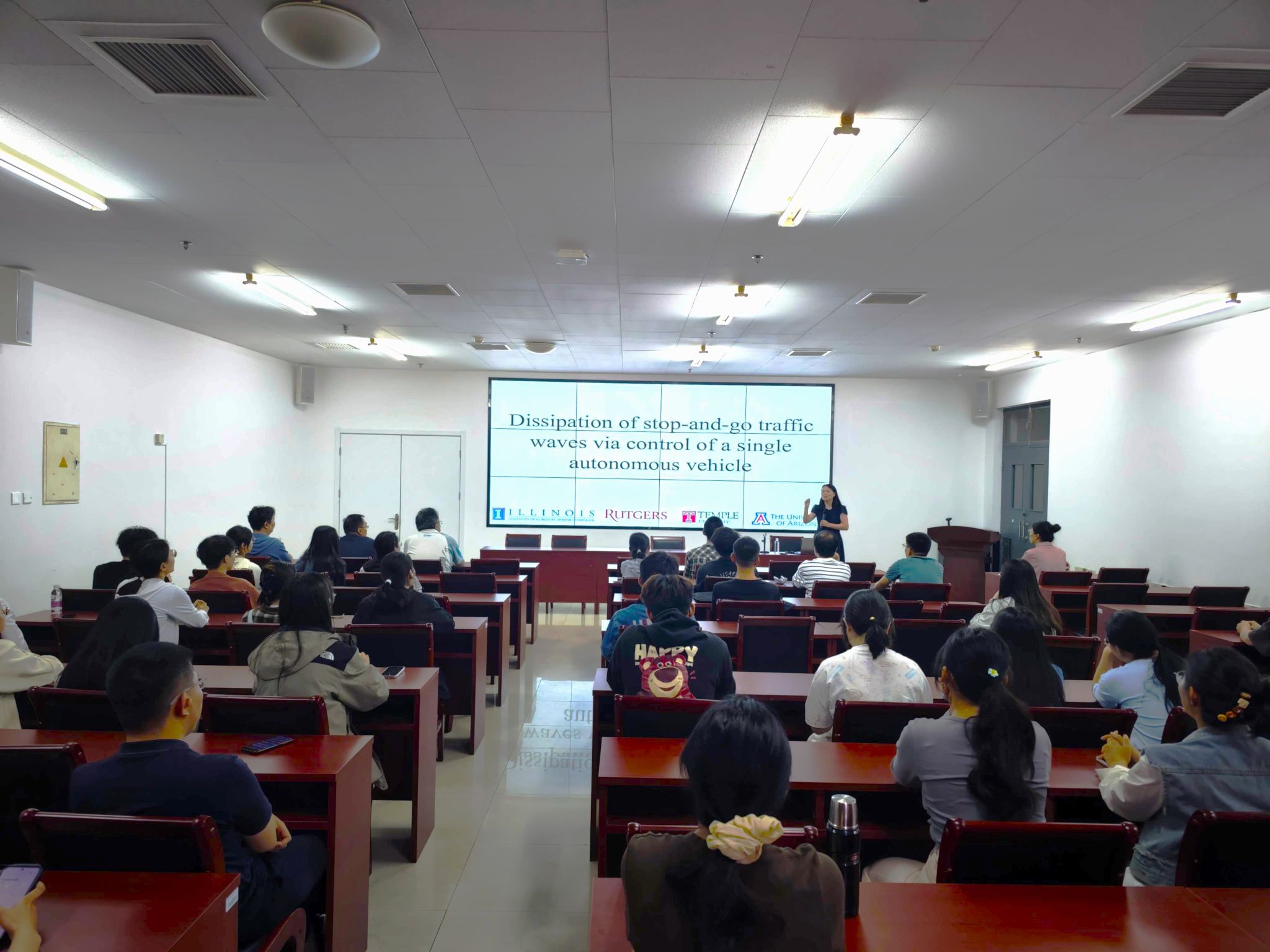 讲座中,弓小倩从微观、中观与宏观三个层面,探讨了交通流模型的数学结构与性质。在微观层面,分析了广泛使用的智能驾驶员模型(Intelligent Driver Model, IDM)的局限性及其改进方案,并讨论了经典的“跟车模型”(Bando-Follow-the-Leader, Bando-FtL)及其带时间延迟的变体的适定性。作为该类模型的一个应用,介绍了如何通过最优巡航控制策略来实现交通流的平稳化,减少“走走停停”的现象。在中观层面,严格推导了一个有限维混合系统的平均场极限,该系统用于描述多车道、多类型车辆(包括人工驾驶与自动驾驶车辆)下的交通流行为,从而建立微观模型与宏观模型之间的联系。在宏观层面,简要介绍了一种非局域 Aw-Rascle-Zhang (ARZ) 模型的适定性分析,该模型引入了远距离车辆间的相互作用机制。此外,还通过数值模拟和实地实验结果展示了相关理论的现实意义和工程应用潜力。